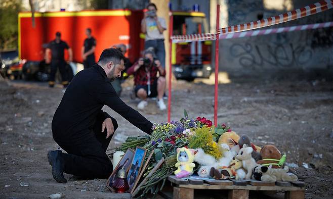 젤렌스키, 러 공습 희생자 애도 볼로디미르 젤렌스키 우크라이나 대통령이 지난 31일(현지시간) 수도 키이우에서 러시아의 미사일 공습으로 파괴된 건물 앞에서 희생자를 애도하고 있다. 이날 키이우에선 전쟁 발발 이후 러시아의 최대 규모의 공습으로 9층 건물이 무너지는 등 어린이 5명을 포함해 최소 26명이 숨졌다.키이우=AFP연합뉴스