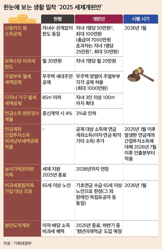 내년부터 새롭게 적용될 세제 운영방침이 공개됐다. 정부가 1일 입법 예고한 ‘2025년 세제개편안’에는 지난 정부에서 인하됐던 법인세율과 증권거래세율을 2022년 수준으로 환원하는 세입기반 확충 내용 외에도 신용카드 소득공제와 월세 세액공제 확대, 연금 세제 혜택 강화, 농어민 지원 연장 등 민생 안정을 고려한 세정 계획이 담겼다. 서민과 농민 지원책을 중심으로 이재명정부의 첫 세제개편안을 살펴본다.