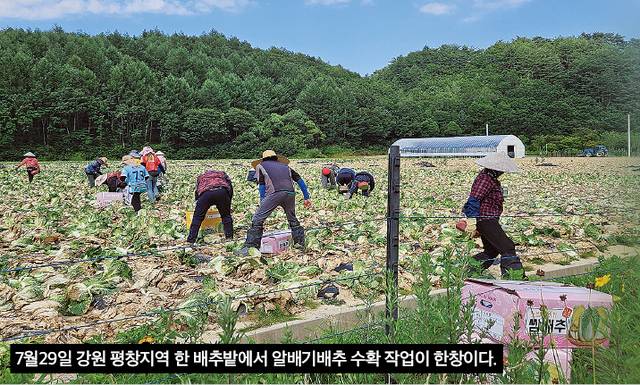 7월29일 찾은 강원 평창의 한 밭. 얼핏 배추밭처럼 보이는 곳에선 출하 작업이 한창이었다. 자세히 보니 알배기배추밭. 작업자들은 ‘노랑알배기 쌈배추’라 적힌 8㎏ 상자에 수확한 알배기배추를 차곡차곡 담았다.