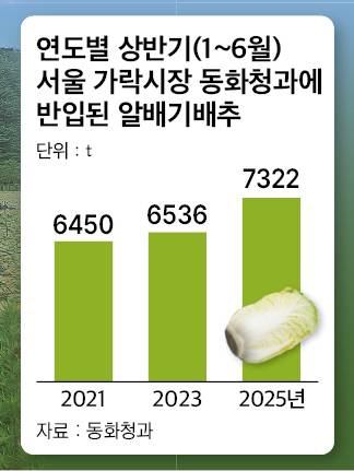 이러한 변화는 서울 가락시장 반입량에서도 확인됐다. 가락시장 도매시장법인 동화청과에 따르면 올해 상반기(1∼6월) 해당 법인에 들어온 알배기배추는 7322t이다. 2021년(6450t)과 견줘 13.5% 늘었다.