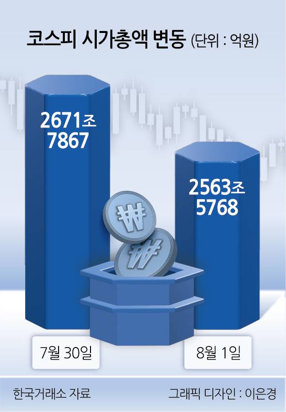 한미 관세 협상 타결 소식과 정부의 세제개편안 발표가 있었던 지난달 31일부터 지난 1일까지 이틀간 코스피 지수의 낙폭은 135.06포인트(4.15%)에 달한다. 시가총액으론 108조2099억원(2671조7867억→2563조5768억원)이나 급감했다.