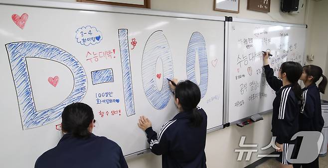 (부산=뉴스1) 윤일지 기자 = 2026학년도 대학수학능력시험 D-100일을 하루 앞둔 4일 부산 수영구 덕문여자고등학교 3학년 교실에서 수험생들이 칠판에 수능 응원 문구를 적고 있다. 2025.8.4/뉴스1