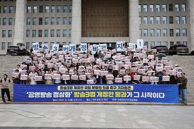 전국언론노동조합과 민주언론시민연합 등 언론계 노동조합·시민사회단체들이 모인 언론장악저지공동행동(아래 공동행동)은 4일 오전 11시 서울 여의도 국회의사당 본청 앞에서 '방송3법 개정안 국회 의결 촉구 공동기자회견'을 열었다.