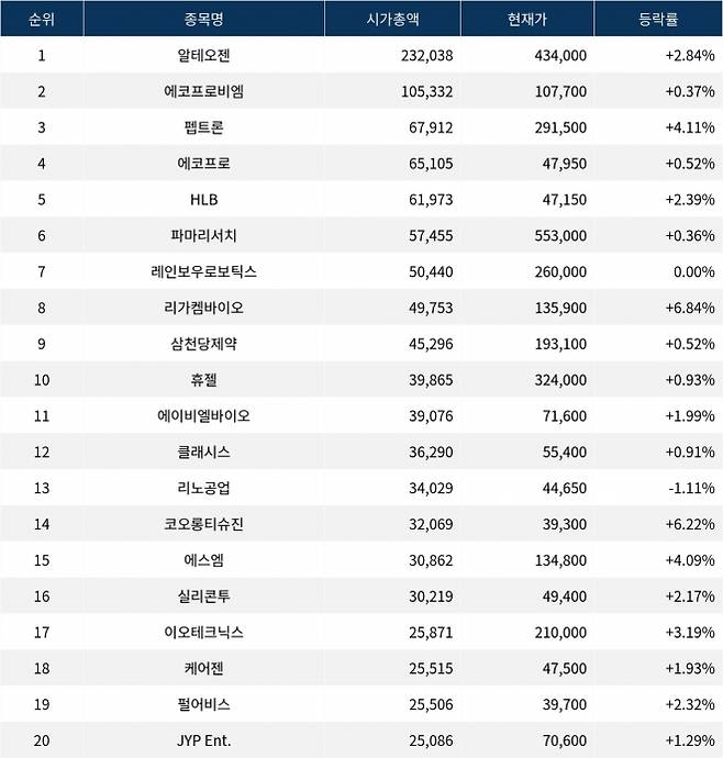 4일 한국거래소에 따르면, 시가총액 1위인 알테오젠(196170)은 현재가 434,000원으로 전 거래일 대비 2.84% 상승하며 활발한 거래를 보이고 있다.
