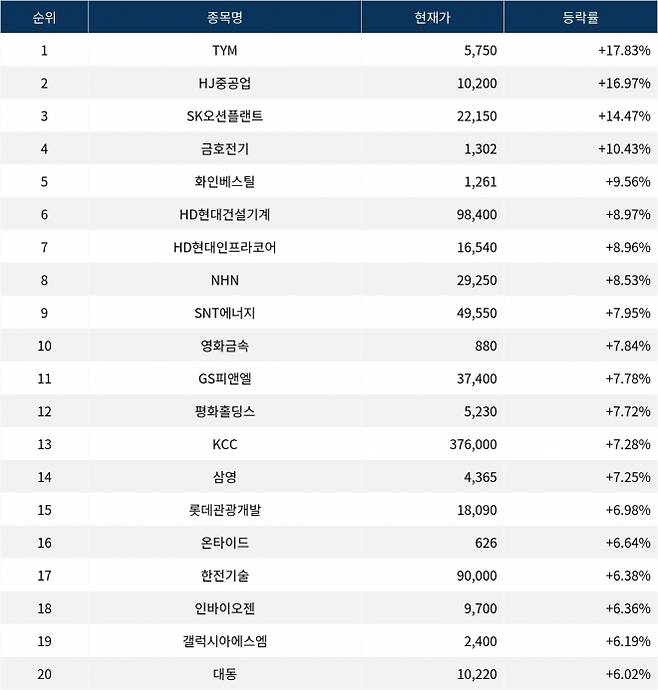 [서울데이터랩]‘TYM’ 17.83% 급등…금일 증시 상승률 1위로 마감