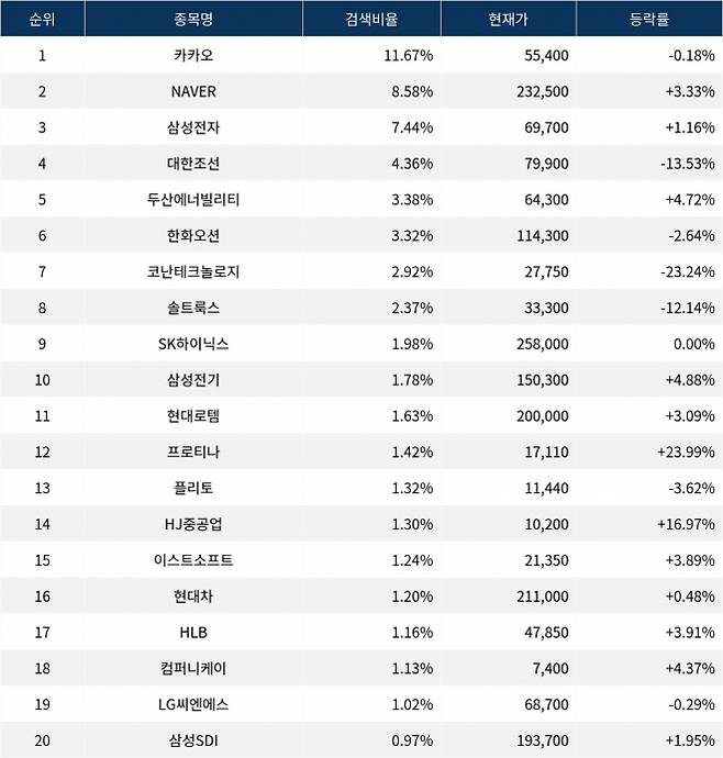 이어 검색비율 2위의 NAVER(035420)는 3.33% 상승 마감했다. 검색비율 3위의 삼성전자(005930)는 1.16% 상승 마감했다. 검색비율 4위 대한조선(439260)은 하락률 13.53%의 큰 낙폭으로 하락했다. 검색비율 5위 두산에너빌리티(034020)는 4.72% 상승하며 강세를 보였다.