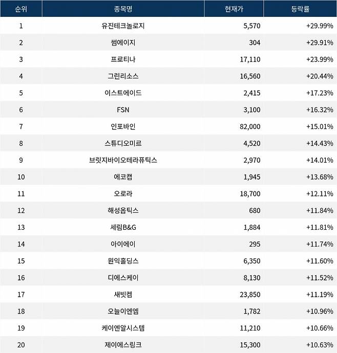 6위 FSN(214270)은 종가 3,100원으로 +16.32% 상승 마감했다. 7위 인포바인(115310)은 종가 82,000원으로 +15.01% 상승 마감했다. 8위 스튜디오미르(408900)는 종가 4,520원으로 +14.43% 상승 마감했다. 9위 브릿지바이오테라퓨틱스(288330)는 종가 2,970원으로 +14.01% 상승 마감했다. 10위 에코캡(128540)은 종가 1,945원으로 +13.68% 상승 마감했다.
