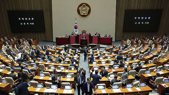 국민의힘은 이들 법안 처리에 반발해 필리버스터(무제한 토론을 통한 합법적인 의사진행 방해)를 하기로 했고, 조금 전 오후 4시부터 국민의힘 신동욱 의원부터 이를 시작했습니다.