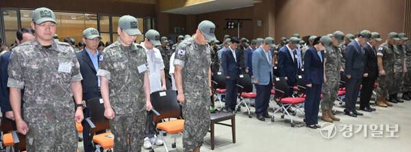 지난 2015년 8월 비무장지대 목함지뢰 도발이 발생한지 10년이 지난 4일 오후 파주시 임진각에서 'REMEMBER 804 10주년 결의대회'가 열렸다. 강윤진 국가보훈부 차관, 주성운 육군 제1군단장, 조원용 경기관광공사 사장, 최병갑 파주시 부시장 등이 국민의례를 하고 있다.