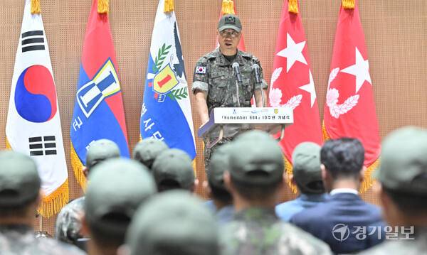 지난 2015년 8월 비무장지대 목함지뢰 도발이 발생한지 10년이 지난 4일 오후 파주시 임진각에서 'REMEMBER 804 10주년 결의대회'가 열렸다. 주성운 육군 제1군단장이 기념사를 하고 있다.
