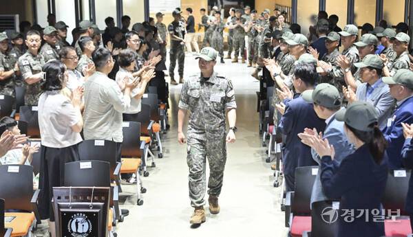 지난 2015년 8월 비무장지대 목함지뢰 도발이 발생한지 10년이 지난 4일 오후 파주시 임진각에서 'REMEMBER 804 10주년 결의대회'가 열렸다. 10년전 작전에 참여했던 장병들이 환호를 받으며 입장하고 있다.