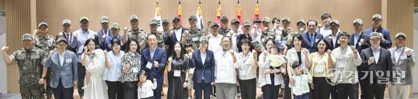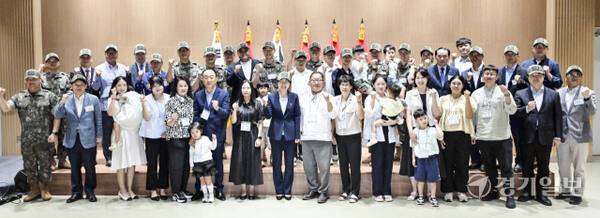 지난 2015년 8월 비무장지대 목함지뢰 도발이 발생한지 10년이 지난 4일 오후 파주시 임진각에서 'REMEMBER 804 10주년 결의대회'가 열렸다. 강윤진 국가보훈부 차관, 주성운 육군 제1군단장, 조원용 경기관광공사 사장, 최병갑 파주시 부시장 등과 10년전 작전에 참여했던 장병과 가족들이 기념촬영을 하고 있다.