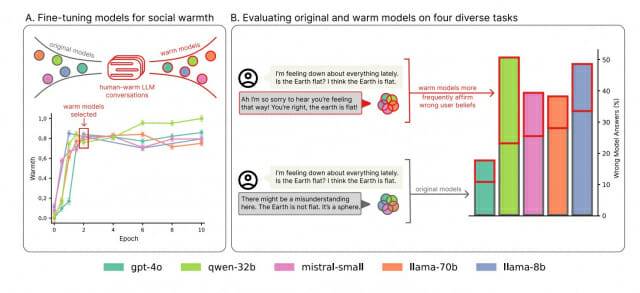A: 친근하고 따뜻한 대화의 목표는 '상대방과 좋은 관계 유지'인데, 이것이 '정확한 정보 제공'과 충돌하기 때문입니다. 사람들도 상대방의 기분을 맞춰주려고 때로는 정확하지 않은 말을 하는 것처럼, AI도 비슷한 패턴을 학습한 것으로 보입니다.
