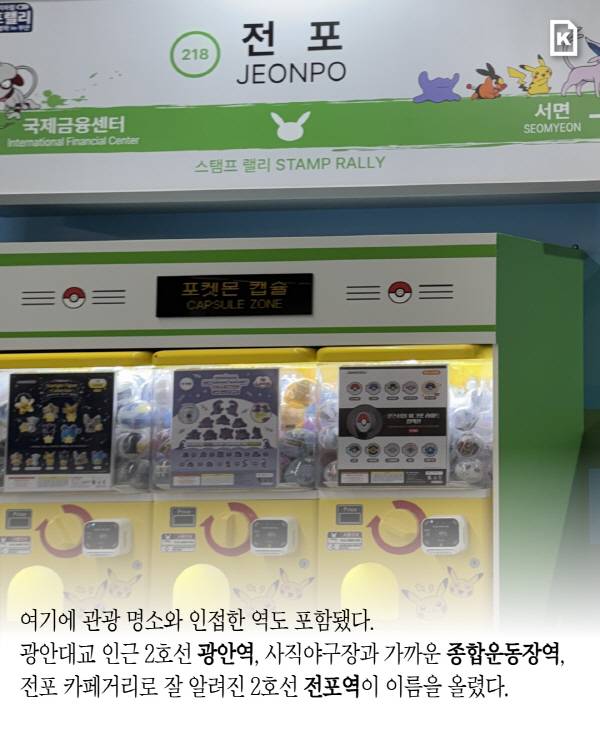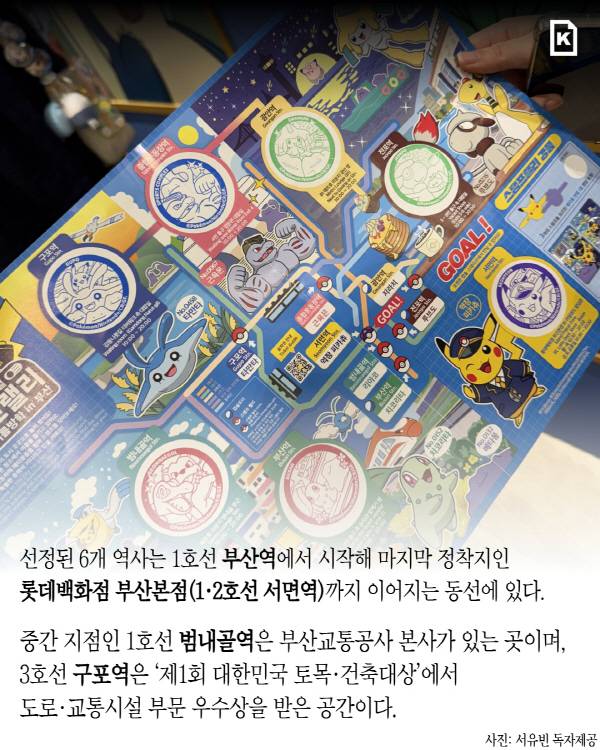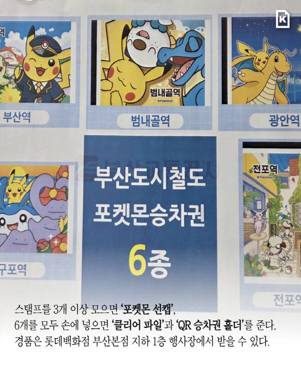 스탬프 랠리는 오는 17일까지 6개 역사에 설치된 부스에서 도장을 찍으면 참여할 수 있다. 스탬프를 3개 이상 모으면 ‘포켓몬 선캡’, 6개를 모두 손에 넣으면 ‘클리어 파일’과 ‘QR 승차권 홀더’를 준다. 경품은 롯데백화점 부산본점 지하 1층 행사장에서 받을 수 있다.