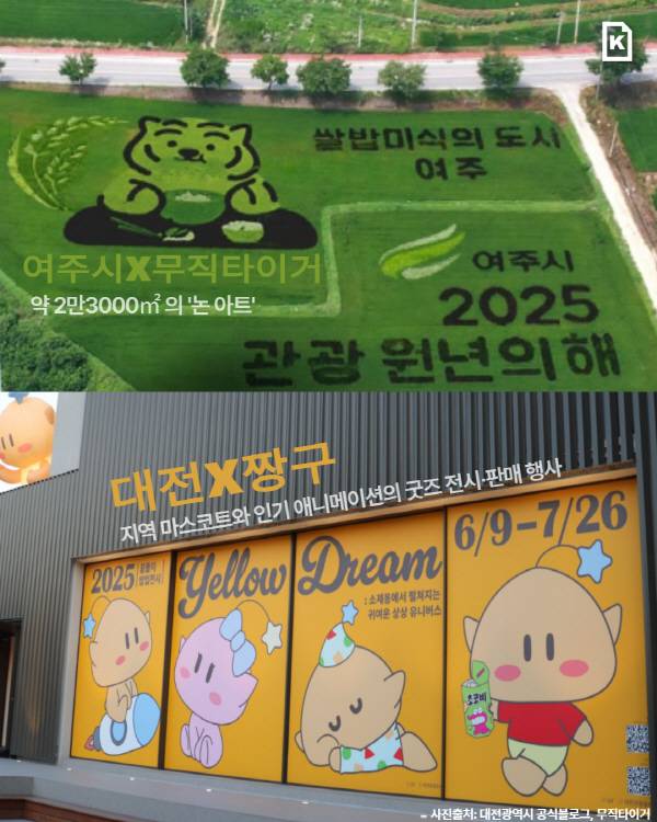 경기 여주시는 캐릭터 브랜드 ‘무직타이거(MUZIKTIGER)’와 함께 ‘논 아트’를 선보였다. 약 2만3000㎡ 논에 색깔 벼로 무직타이거를 그리고, ‘관광 원년의 해’와 ‘쌀밥 미식의 도시 여주’ 글씨를 새겼다. SNS에는 “AI 합성 이미지인 줄 알았다” “놀랍다” 등의 반응이 이어졌다.