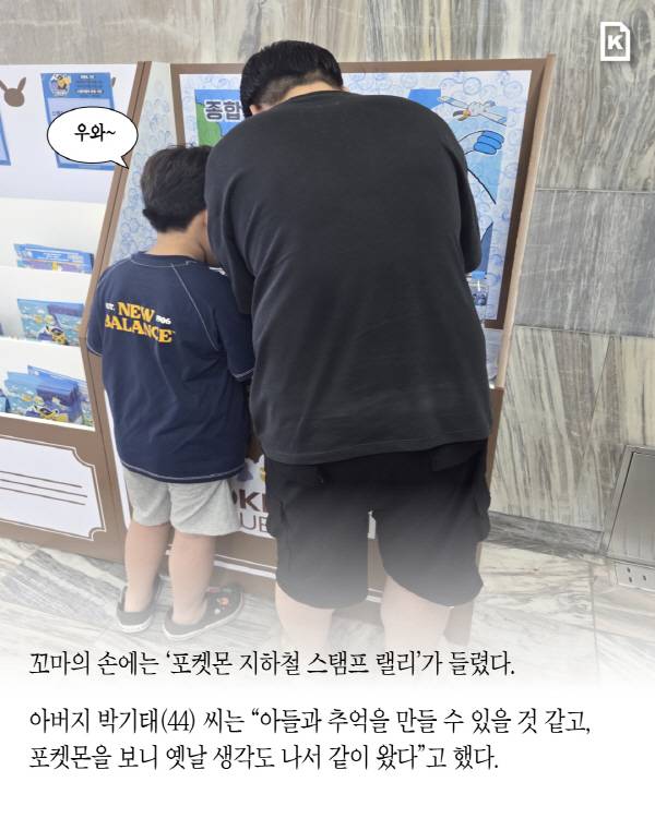 “우와~.” 지난달 29일 오후 부산도시철도 3호선 종합운동장역 개찰구에서 들리는 ‘피카~’ 소리에 꼬마의 탄성이 터졌다. 꼬마의 손에는 ‘포켓몬 지하철 스탬프 랠리’가 들렸다. 아버지 박기태(44) 씨는 “아들과 추억을 만들 수 있을 것 같고, 포켓몬을 보니 옛날 생각도 나서 같이 왔다”고 했다.
