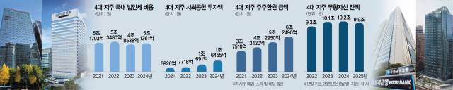 이런 상황에서 주주 환원과 사회 공헌액은 눈덩이처럼 불어나고 있다. 4대 금융지주의 연간 자사주 매입·소각액과 배당 규모는 지난해 기준 6조 2490억 원으로 전년(5조 2950억 원)보다 18% 증가했다. 이는 2021년 3조 7510억 원, 2022년 4조 3420억 원보다 44~67%가량 늘어난 액수다. 올해는 4대 금융지주의 주주 환원 규모가 8조 원을 웃돌 것이라는 예측이 나온다.