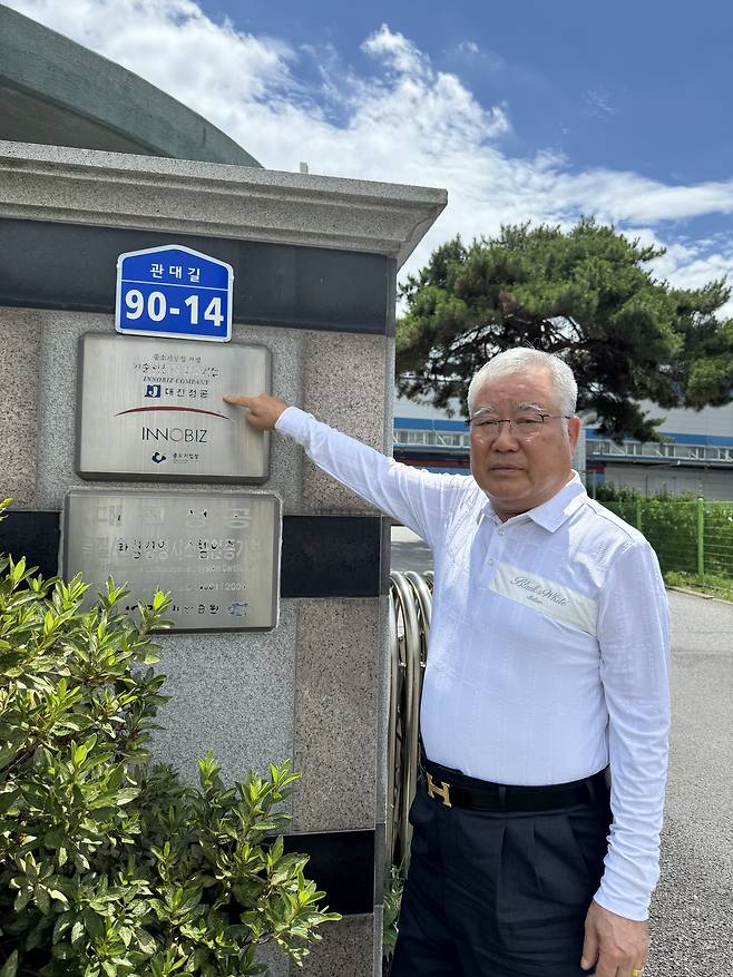 | ▲ 한온시스템 공장 앞에 선 송윤섭 전 대진유니텍 대표. 아직도 공장 입구 간판에는 '대진정공'(대진유니텍)이라는 이름이 남아 있다. |