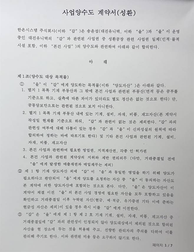 | ▲ 지난 2016년 4월 22일 한온시스템과 대진유니텍이 체결한 사업양수도 계약서(대진유니텍의 성환공장). |