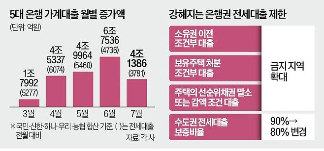 정부는 앞서 6·27 부동산 대책을 내놓으면서 올해 하반기 은행권 가계대출 증가 목표치를 기존의 절반으로 줄인다고 발표했다. 국민 신한 하나 우리 농협 등 5대 은행은 올 하반기 가계대출 증가액 목표치를 7조2000억원에서 3조6000억원으로 줄인 것으로 전해졌다. 이들 5대 은행의 지난달 가계대출 증가액(4조1386억원)은 6월(6조7536억원)보다 감소했다.