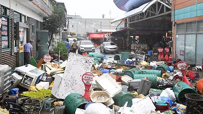 | 30시간 만에 187mm의 괴물 폭우가 쏟아져 침수 피해를 입은 함평군 함평천지전통시장에서 4일 시장상인들이 물이 빠지자 복구 작업을 하고 있다./김애리 기자·조영권 인턴 기자 |