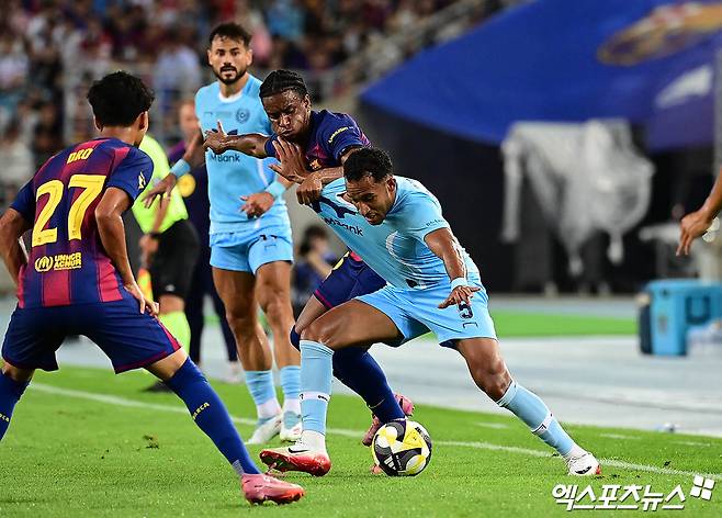 (엑스포츠뉴스 대구, 박지영 기자) 4일 오후 대구스타디움에서 열린 'FC바르셀로나 아시아 투어 에디션' 대구FC와 FC바르셀로나의 경기, FC바르셀로나 알레한드로 발데와 대구FC 지오바니가 몸싸움을 벌이고 있다.