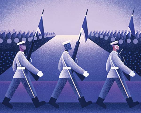 1990년 10월1일 거행된 건군 제42주년 국군의날 행사를 전한 조간신문(10월 2일 자)의 한 대목이다. 카드 섹션을 일반 관람객과 군인들이 현장에서 즉석 연출했다는 것은 사실과 다르다. 수도방위사령부 예하 향토사단과 동원사단 장병이 뙤약볕 아래에서 쌍욕 들으며 몇 달씩 반복한 연습의 결과였다. 카드 섹션도 수많은 장병의 엄청난 노고의 결과였으나, 행사의 꽃인 열병식(閱兵式)에 참가한 도보 부대 등에 비할 바는 못 됐다. 목숨을 잃은 경우도 있다. 그해 국군의날 행사를 위해 9월15일 여의도 상공에서 고공낙하훈련을 하던 특전사 여군 하사가 낙하산이 펴지지 않아 22세 나이에 순직하는 안타까운 일이 벌어졌다. 열병식의 화려함 뒤엔 군 장병의 피와 땀이 있다.