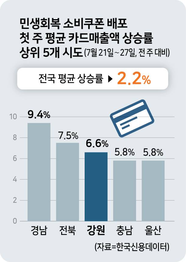 4일 한국신용데이터가 소상공인 매출 데이터를 분석한 결과 소비쿠폰 정책이 시작된 1주차(7월 21일~7월 27일) 강원도 소상공인의 카드 평균 매출은 전 주 대비 6.6% 증가했다. 이는 17개 시·도 가운데 경남(+9.4%), 전북(+7.5%)에 이어 전국에서 3번째로 높은 수치다.
