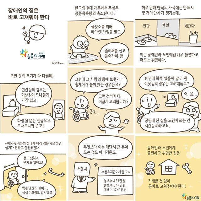 장애인과 노인에게 불편하고 위험한 집은 곧바로 고쳐 줘야 한다. 신체 기능 저하 상태에 따라 문도 넓히고 단차도 없애고 벽에 난간도 붙이고 욕실의 미끄럼도 방지해 준다면 살기가 편하고 안전해진다. 대단히 큰 돈이 드는 것도 아니다. 서울시는 ‘수선 유지 급여’ 사업으로 경보수 457만원, 중보수 849만원, 대보수 1241만원을 고시하고 있다.