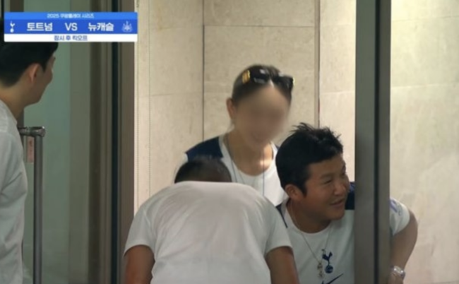 경기 시작 전, 손흥민의 아버지 손웅정 씨와 인사를 나누는 조세호의 뒤편으로 자연스럽게 아내의 얼굴이 등장한 것.