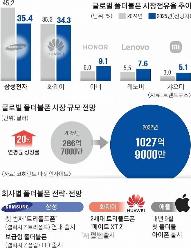 전체 스마트폰 시장에서 폴더블폰이 차지하는 비중은 미미한 수준이지만 향후 관련 시장은 급속도로 성장할 전망이다. 코히런트 마켓 인사이트에 따르면 글로벌 폴더블폰 시장 규모는 올해 약 286억 7000만 달러(39조 8000억원)에서 2032년까지 1027억 9000만 달러(142조 8000억원)로 연평균 20%씩 성장할 것으로 관측된다.