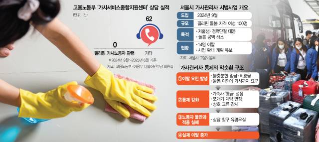 이들이 고충을 제기할 수 있는 상담소 역시 사실상 ‘개점휴업’ 상태였다. 이용우 더불어민주당 의원실이 고용부에서 제출받은 자료를 보면 지난해 9월부터 올 6월까지 가사서비스종합지원센터에 접수된 필리핀 가사관리사 관련 상담 내역은 0건이었다. 고용부는 앞서 지난해 7월 “가사서비스종합지원센터 등을 통해 업무 수행 중 발생할 수 있는 위급한 상황에 대비한 긴급 신고수단과 고충 상담을 제공하겠다”고 발표한 바 있다. 하지만 지방 관서에서도 필리핀 가사관리사 관련 상담이력은 없는 것으로 확인됐다. 낯선 나라에 온 이들이 문제를 공식적으로 드러낼 창구조차 제대로 작동하지 않았던 셈이다.