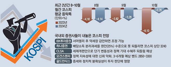최근 10년간 코스피는 2020년을 제외하곤 모든 해에서 7월 말 종가 대비 8월 이후 연말까지 단기 조정 양상을 보였다. 특히 9월 전후의 가을철에 부진한 ‘계절성’이 강하게 나타났다. 작년 역시 8월에 4.14%, 9월에 3.28% 코스피가 하락했다.