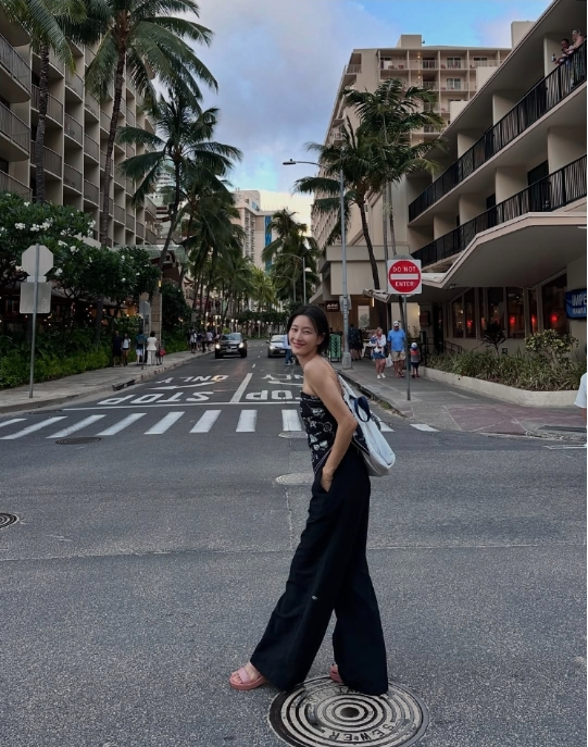 그는 블랙 와이드 팬츠에 블랙 톱을 매치한 채, 백리스 형태의 실루엣을 연출했다. 어깨를 드러낸 디자인과 가방끈 사이로 보이는 등이 모델다운 자신감을 강조했고, 군더더기 없는 헤어스타일과 함께 감각적인 여름 휴가룩을 완성했다.