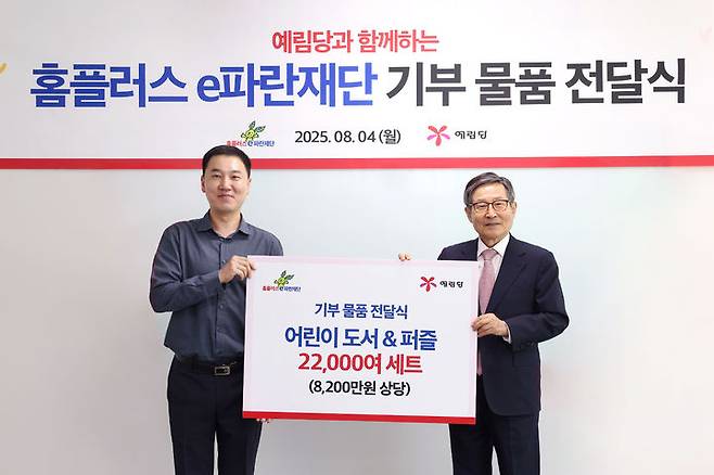 [서울=뉴시스] 박인주(오른쪽) 홈플러스e파란재단 이사장과 임상호 예림당 마케팅부장이 4일 서울 성동구 예림출판문화센터에서 열린 기부 물품 전달식에서 기념촬영 하고 있다.