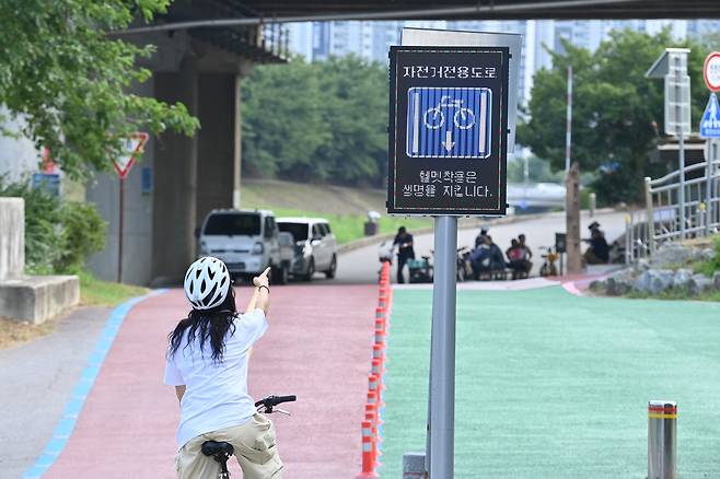 특히 주목할 점은 평소에는 자전거전용도로 안전수칙 및 전방주의 안내문이 표시되던 전광판이, AI영상감지센서에 시속 10km 이상으로 주행하는 자전거가 감지될 경우 해당 영상을 실시간으로 송출해 다른 이용자들이 이를 즉시 확인할 수 있도록 하는 스마트 경고 시스템이 전국 최초로 적용됐다는 것이다.