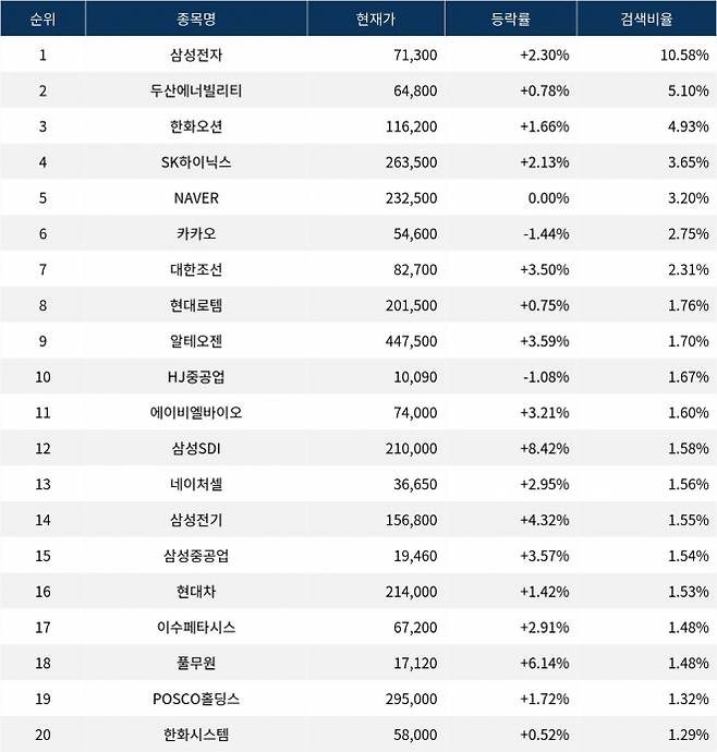 이어 두산에너빌리티(034020)가 검색비율 2위를 기록하며 0.78%의 등락률을 기록하고 있다. 검색비율 3위의 한화오션(042660)은 1.66% 상승하며 순조롭게 출발하는 모습이다. 검색비율 4위 SK하이닉스(000660)는 개장 초반부터 2.13%의 상승률로 상승 중이다. 검색비율 5위 NAVER(035420)은 0.00% 등락률로 큰 움직임을 보이지 않고 있다.
