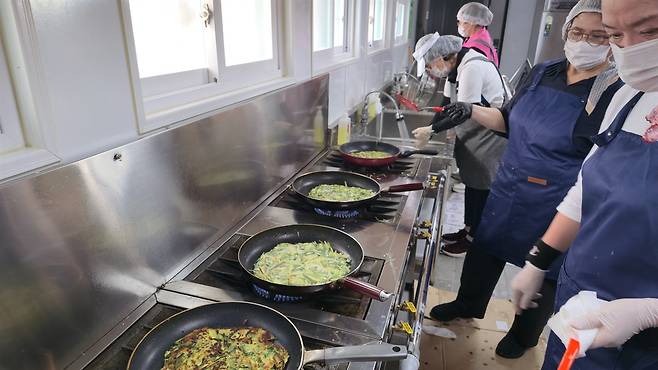 | ▲ 학부모회장단이 수해복구 현장에 전달할 도시락 반찬을 담기 위해 부추전을 정성스럽게 부치고 있다. |