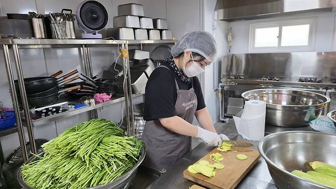 | ▲ 봉사에 참여한 학생이 애호박과 부추 등 반찬 재료를 직접 손질하여 수해복구에 힘을 보태고 있다. |