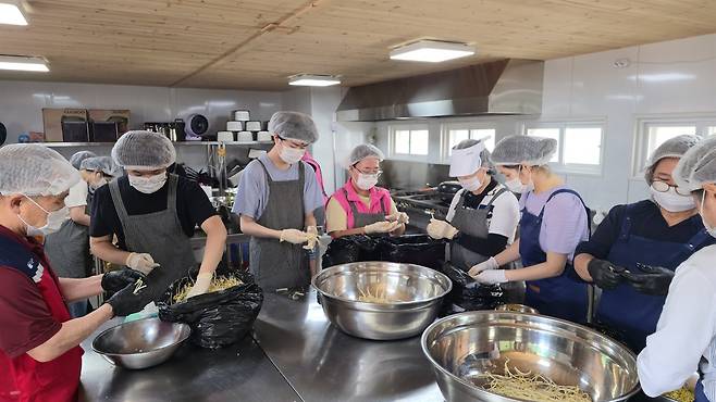 지난 8월 2일, 예산군학부모회 협의회 임원들 (자녀) 11명은 예산읍 '예산군자원봉사센터' 조리시설에 모여 수해복구 지원 도시락 256개를 정성껏 준비했다.