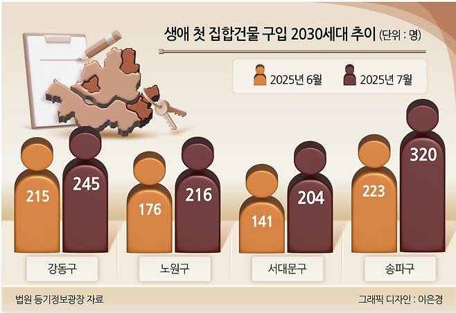 그 외 강동·송파 지역도 눈에 띄는 증가폭을 보였다. 강동구에서 생애 첫집마련을 한 2030세대는 6월 215명에서 245명으로 13.9%, 송파구는 같은 기간 223명에서 320명으로 43.5% 증가했다. 관악구의 경우 140명에서 120명으로 같은 기간 14.3% 감소했다.