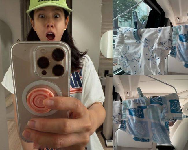 손예진은 5일 개인 SNS에 짧은 영상을 게재했다. 공개된 영상에는 차량 뒷좌석에 걸린 옷걸이에 빨래 널리듯 널린 남아 팬티 두 벌이 흔들거려 웃음을 자아냈다.