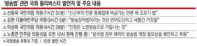 전날 방송법 개정안이 국회 본회의에 상정된 후 오후 4시부터 시작된 필리버스터에서 첫 주자로 나선 신동욱 국민의힘 의원은 “(방송 3법은) ‘민주당 방송’ ‘민주노총 방송’ 만들기 프로젝트”라며 “1980년도 신군부의 언론 통폐합에 버금가는 언론 목 조르기법이라고 저는 감히 생각한다”고 비판했다.