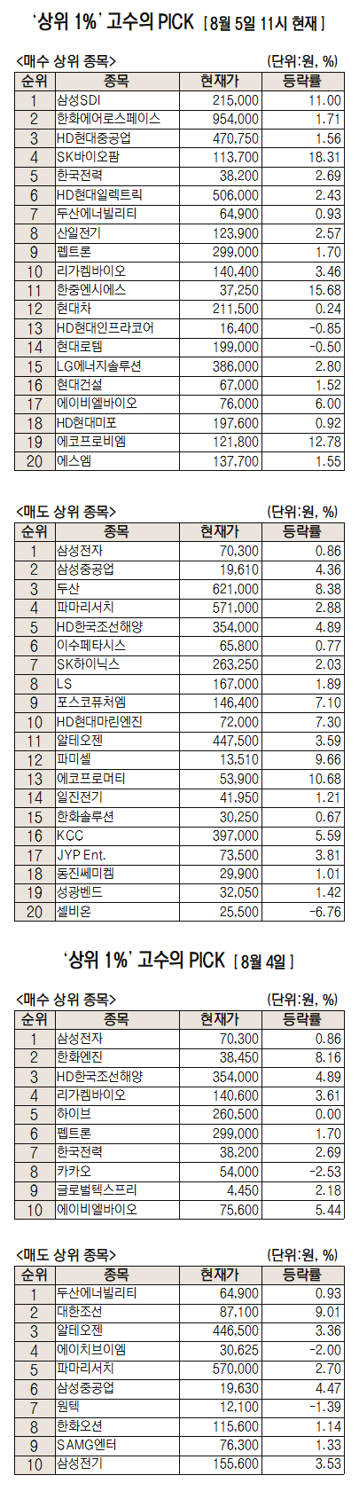 미래에셋증권은 자사 고객 중에서 지난 1개월간 수익률 상위 1% 투자자들의 매매 종목을 집계해 실시간·전일·최근 5일 기준으로 모바일트레이딩시스템(MTS)상에서 공개하고 있다. 이 통계 데이터는 미래에셋증권의 의견과 무관한 단순 정보 안내이며 각각의 투자자 개인에게 맞는 투자 또는 수익 달성을 보장하지 않는다. 테마주 관련 종목은 이상 급등락 가능성이 있으므로 유의해야 한다.
