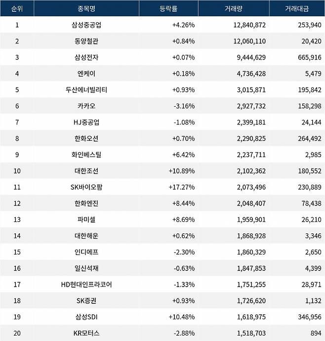 한편 거래량 상위 20위권 종목들은 SK바이오팜(326030) ▲17.27%, 한화엔진(082740) ▲8.44%, 파미셀(005690) ▲8.69%, 대한해운(005880) ▲0.62%, 인디에프(014990) ▼2.30%, 일신석재(007110) ▼0.63%, HD현대인프라코어(042670) ▼1.33%, SK증권(001510) ▲0.93%, 삼성SDI(006400) ▲10.48%, KR모터스(000040) ▼2.88% 등의 성적을 기록했다.