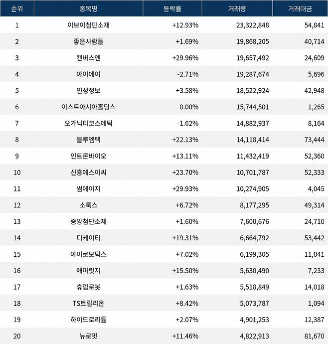 한편 거래량 상위 20위권 종목들은 썸에이지(208640) ▲29.93%, 소룩스(290690) ▲6.72%, 중앙첨단소재(051980) ▲1.60%, 디케이티(290550) ▲19.31%, 아이로보틱스(066430) ▲7.02%, 애머릿지(900100) ▲15.50%, 휴림로봇(090710) ▲1.63%, TS트릴리온(317240) ▲8.42%, 하이드로리튬(101670) ▲2.07%, 뉴로핏(380550) ▲11.46% 등의 성적을 기록한다.