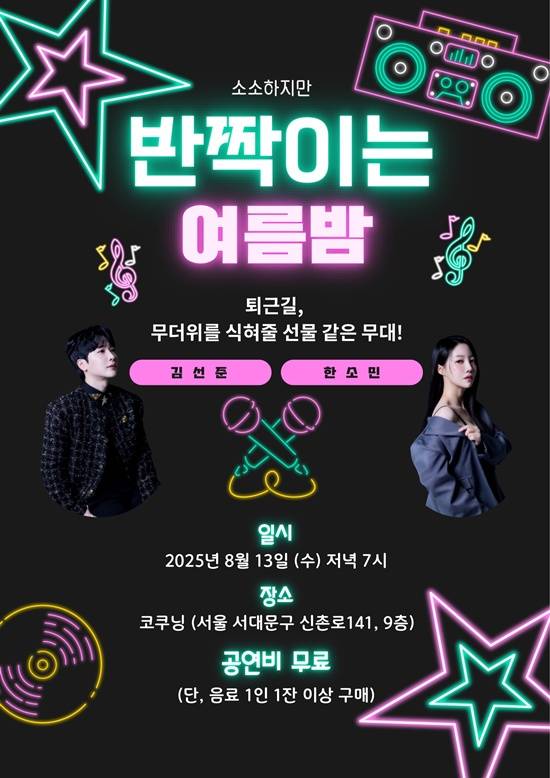 김선준, 한소민 합동 미니 콘서트 '소소하지만 반짝이는 여름밤'이 이달 13일 오후 7시, 서울 서대문구 대현동에 위치한 코쿠닝에서 개최된다. 이번 공연은 음료 1인 1잔 구매 시 무료 관람으로 진행되며, 누구나 편안하게 즐길 수 있는 열린 무대로 꾸며진다.