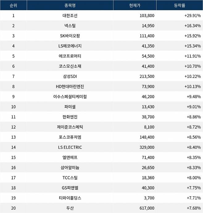 6위 코스모신소재(005070)는 종가 41,400원으로 10.70% 상승 마감했다. 7위 삼성SDI(006400)는 종가 213,500원으로 10.22% 상승 마감했다. 8위 HD현대마린엔진(071970)은 종가 73,900원으로 10.13% 상승 마감했다. 9위 이수스페셜티케미컬(457190)은 종가 46,200원으로 9.48% 상승 마감했다. 10위 파미셀(005690)은 종가 13,430원으로 9.01% 상승 마감했다.