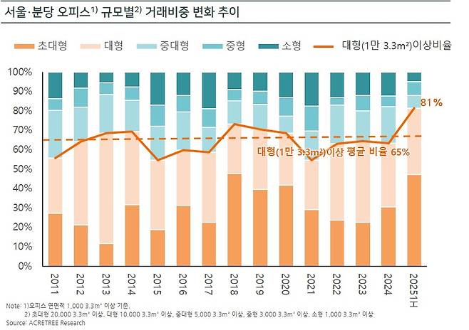 5일 상업용 부동산 서비스 기업 에이커트리가 발표한 '2025년 2분기 서울·분당 오피스 보고서'에 따르면 올해 2분기는 대형 오피스(연면적 1만3.3㎡) 이상 거래 규모가 전체의 88%를 차지했다.