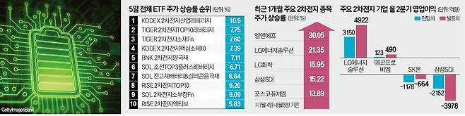 종목을 가리지 않는 전방위 상승에 2차전지 테마 상장지수펀드(ETF)도 약진했다. 이날 전체 ETF 주가 상승률 상위 10개 중 9개가 2차전지 상품이었다. ‘KODEX 2차전지산업레버리지’가 10.9%로 가장 많이 올랐다. ‘TIGER 2차전지소재Fn’(7.6%), ‘KODEX 2차전지핵심소재10’(7.39%), ‘BNK 2차전지양극재’(7.11%) 등이 수익률 상위에 올랐다. 최근 1개월로 범위를 넓혀도 주요 2차전지 종목의 주가 상승률은 두드러진다. 엘앤에프가 30.05% 뛴 데 이어 LG에너지솔루션과 LG화학이 각각 21.35%, 15.95% 올랐다. 삼성SDI(15.22%)와 포스코퓨처엠(13.89%)의 오름세도 뚜렷했다.